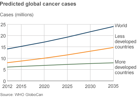 2012年全球最多人罹患的3大癌症为肺癌(180万)、乳癌(170万)、大肠癌(140万),致死率前3名的癌症则是肺癌、肝癌、胃癌。每年全球有420万人死于癌症。每5名男性和每6名女性,就有1人在75岁之前患癌。肺癌上升也与烟草销售增加有关。