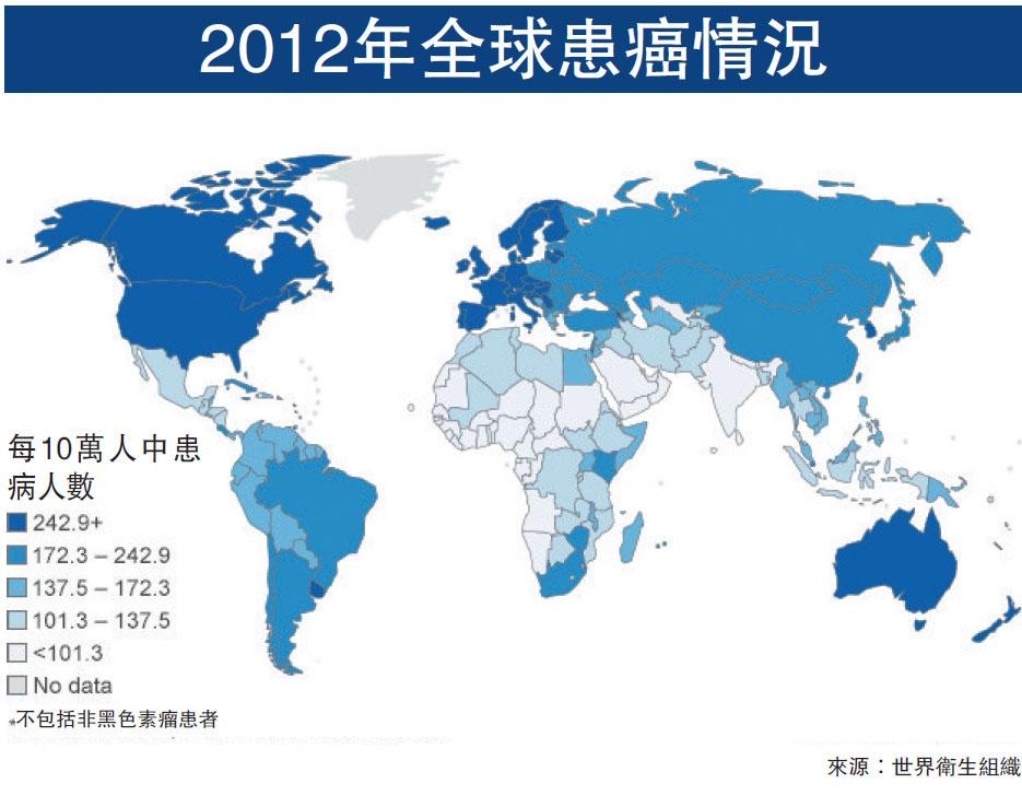 报告认为,全球癌症发病形势严峻,发病率与死亡率呈持续上升趋势,发展中国家首当其冲,占全球新增病例的6成,年度死亡病例的7成。这些地区的民众容易患上宫颈癌、肝癌和胃癌。在2012年,全球新病例有一半发生在亚洲,其中大部分发生在中国。其中,约一半的新增肝癌病例在中国出现,尤其是由乙型肝炎引起的肝癌。