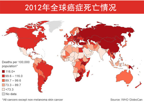 世界卫生组织(WHO)发布最新的研究报告。报告说,中国的癌症在2012年的发病个案几乎占了全球一半,高居第一位,并预测2035年全球新癌症病例将增加近一半。