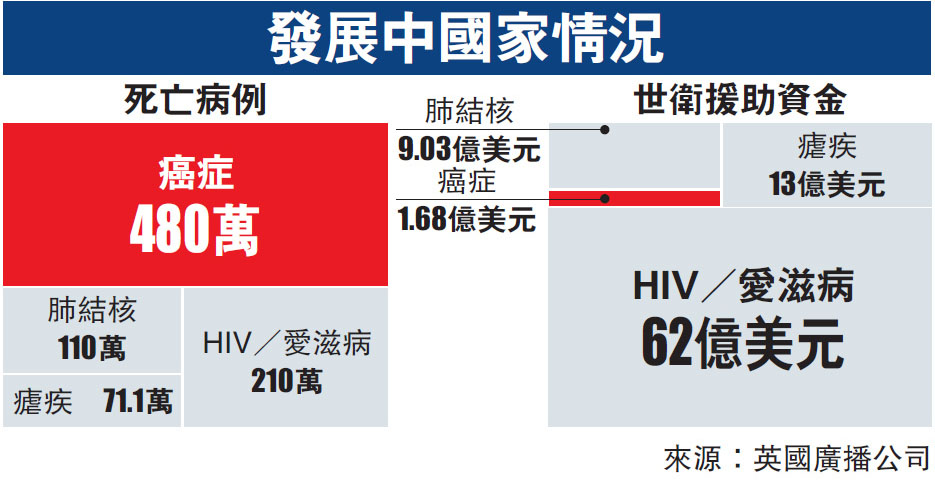 该报告又说,随着全球人口成长与老化,加上愈来愈多人染上不健康的生活习惯,癌症死亡人数可能从每年820万人增至20年之后1300万人。