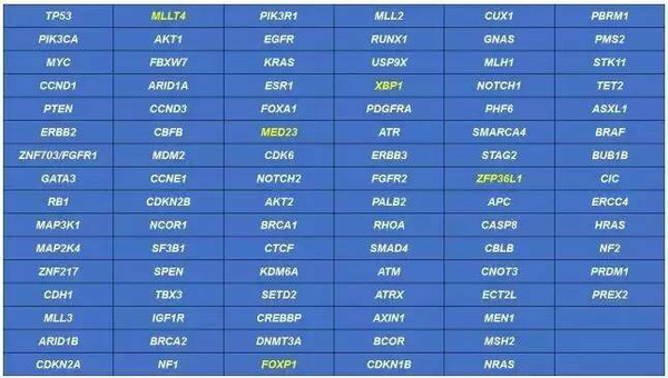 该研究找到的93个基因,黄色高亮的为与乳腺癌相关的新基因,其他的基因发生突变也可能导致乳腺癌的发生