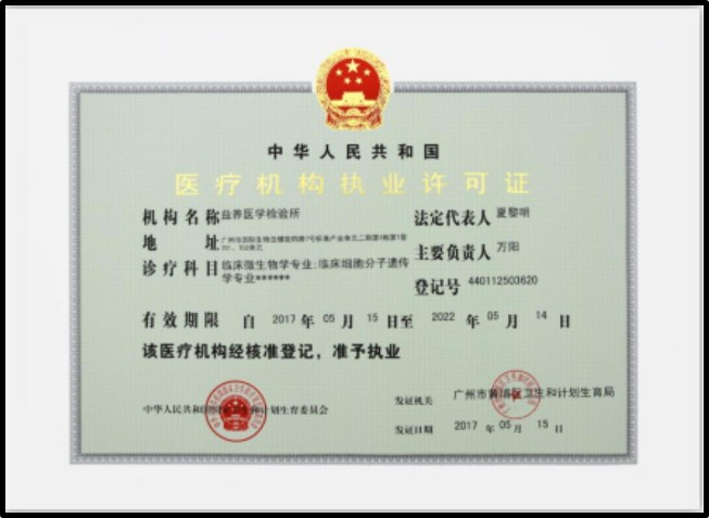 2017年5月15日,广州益养生物科技有限公司旗下益养医学检验所正式获得卫生行政部门颁发的中华人民共和国《医疗机构执业许可证》(登记号:440112503620,医疗机构类别:医学检验所)。